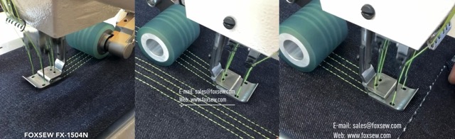 FOXSEW FX-1504N Four needle lockstitch sewing machine with puller, drop feed with synchronous puller, suitable for multiple seaming reinforcing areas of garments as corset stripping, webbings, elastic bands, denim jeans, bedding articles, curtaions, leather upholstery, down coats, blanket binding, light weight tents and parachutes. Needle gauge: 6.4-6.4-6.4mm, 6.4-8-6.4mm, 6.4-9.5-6.4mm. Any special gauge is available customized as well.